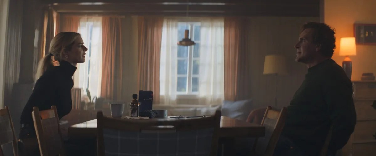 For the most part, Over Your Dead Body is a single-location film. It takes place at the couple’s cabin in a secluded, forested area near a lake. The cabin is fairly spacious and has great lighting for it’s age and size, plus it has a basement that looks like a man cave. It makes for a great setting as the violence ensues. The various fight and action sequences are fairly well done, often featuring characters utilizing whatever is at hand as a weapon and leading to moments that will have the audience laughing and gasping in turn. There are some surprisingly graphic and well done practical effects throughout the film to show the brutal extent of the violence. Another interesting visual is when the film goes into flashbacks, often reaching a certain point of the plot where a surprise is revealed, then jumping back in time with on-screen text telling the audience how far back in time we’re going before showing more context from a different point of view. It all helps to blend the humor of violence throughout the film.