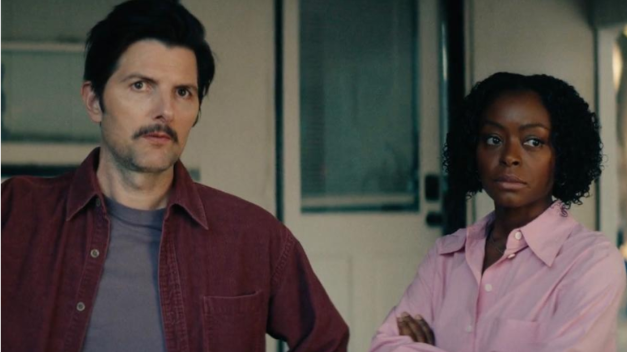 The Saviors is an indie film with a fantastic cast. Danielle Deadwyler (40 Acres, The Woman in the Yard) plays Kim. Deadwyler has been in such a wide variety of films, but she always tends to shine in genre films. She makes sure the audience understands Kim is the rational one in the relationship. Deadwyler makes it clear she’s the voice of reason, which is why Kim’s decision to help Sean investigate makes the situation seem more legitimate. Adam Scott (Hokum, Krampus) plays Sean. Sean is a bit of a loser. He doesn’t have a job, he’s sleeping on the couch until he and Kim officially move out, and he spends most of his days drinking in his man cave. Scott is great in this role not only because he plays the character as a well-meaning idiot, but also because of how he shows Sean try to be different from his family. He wants to be what could be called a liberal white savior, but he can’t help but get caught up in his suspicions towards these strangers. Deadwyler and Scott are also great on screen together, at first coming across as disconnected and uncomfortable, then growing closer and more in sync with each other again. The film also features great performances from Theo Rossi (The Penguin, Carry-On) as Amir and Nazanin Boniadi (Hotel Mumbai, Homeland) as Jahan. Rossi and Boniadi play these characters as quiet, polite renters, yet there is something always just a bit off about their demeanor, making it easy for the audience to become wary of them.